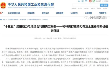 4月25日工业和信息化部节能与综合利用司对外公布了“十三五”废旧动力电池综合利用典型案例,而凭借打造动力电池全生命周期价值链闭环的格林美成功入围。